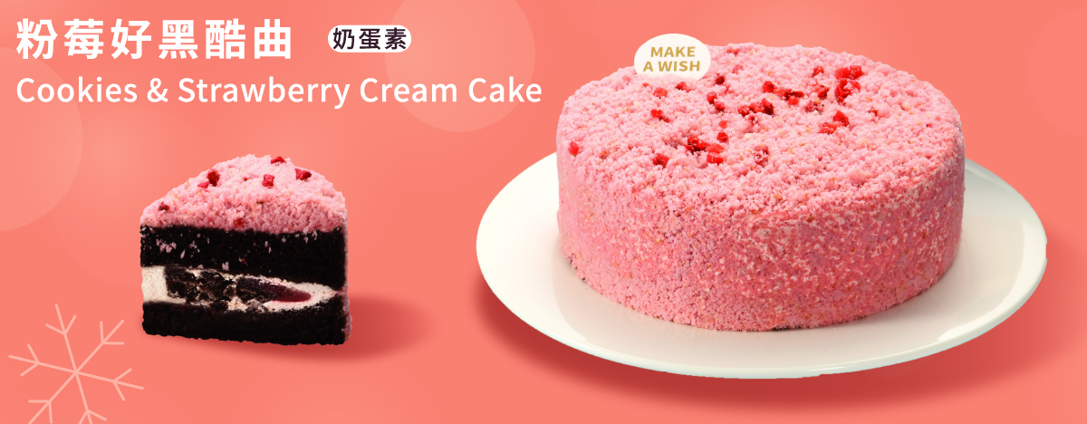 粉嫩俏皮的莓果色,切開來是充滿黑色濃厚OREO風味空氣感十足的鬆軟蛋糕,搭配一層層的草莓覆盆子奶霜與草莓奶霜,讓草莓香氣在蛋糕入口時竄出,莓果酸恰到好處的點綴如同外表上的草莓碎粒,點點酸甜又令人陶醉。
