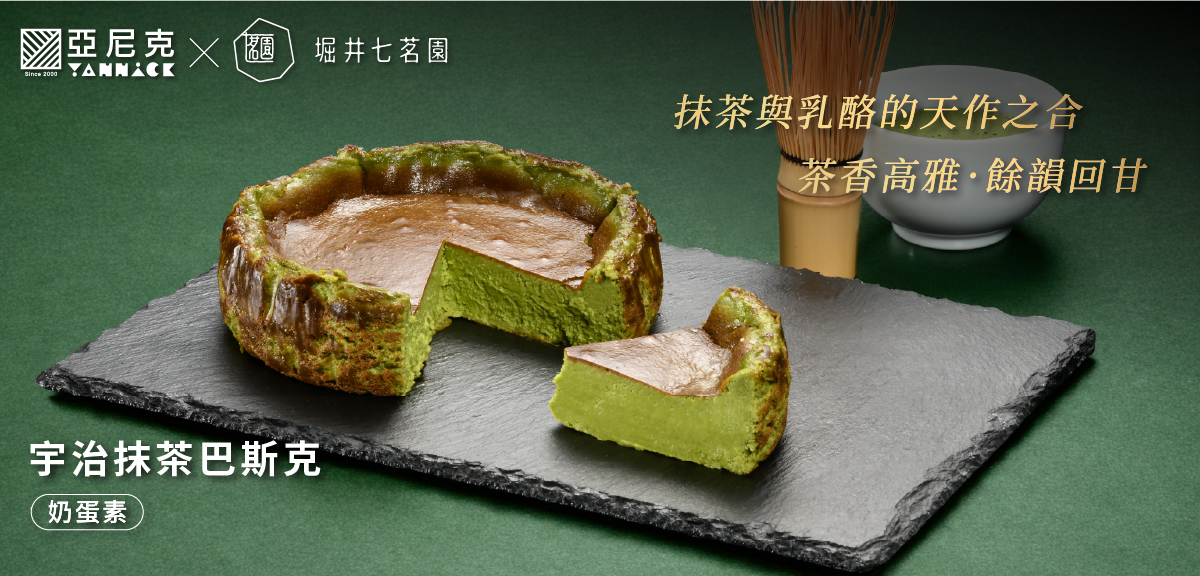 由北海道生起司、高達熟成起司搭配抹茶製成,焦黑的表層洋溢著濃郁的焦糖香氣,半熟口感入口即化,抹茶尾韻茶香高雅、餘韻回甘。