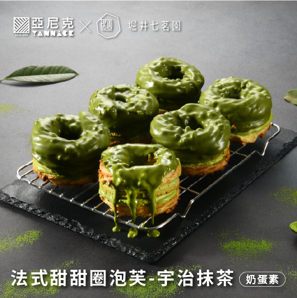 口感介於甜甜圈和泡芙,外層酥脆、內層Q彈柔軟 香酥宇治抹茶泡芙上沾上杏仁碎粒、淋面是宇治抹茶、比利時白巧克力等打造的甜蜜脆皮口感,搭配內餡以宇治抹茶奶霜和泡芙蛋糕堆疊著酥脆又柔軟的層次,活潑又俏皮的刺激著味蕾。
