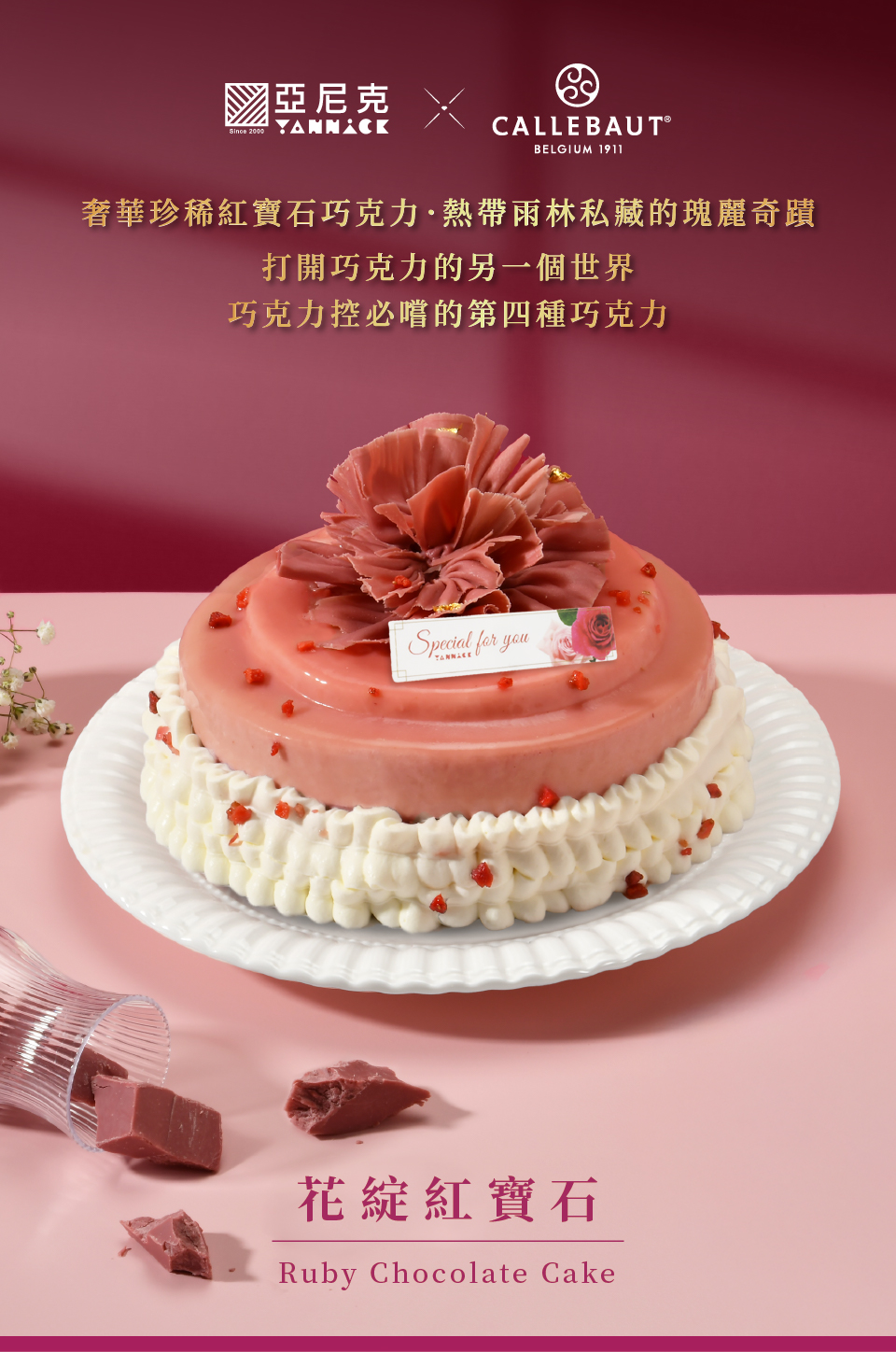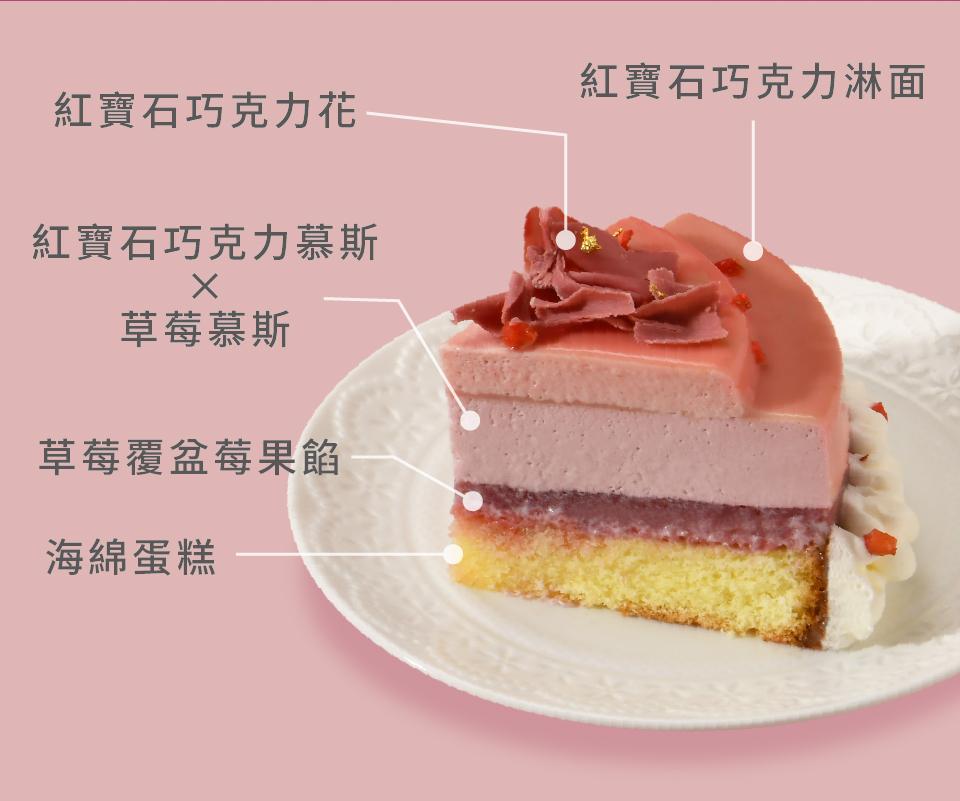 主要內容物:紅寶石巧克力花/紅寶石巧克力淋面/海綿蛋糕/草莓覆盆莓果餡/紅寶石巧克力慕斯/草莓慕斯