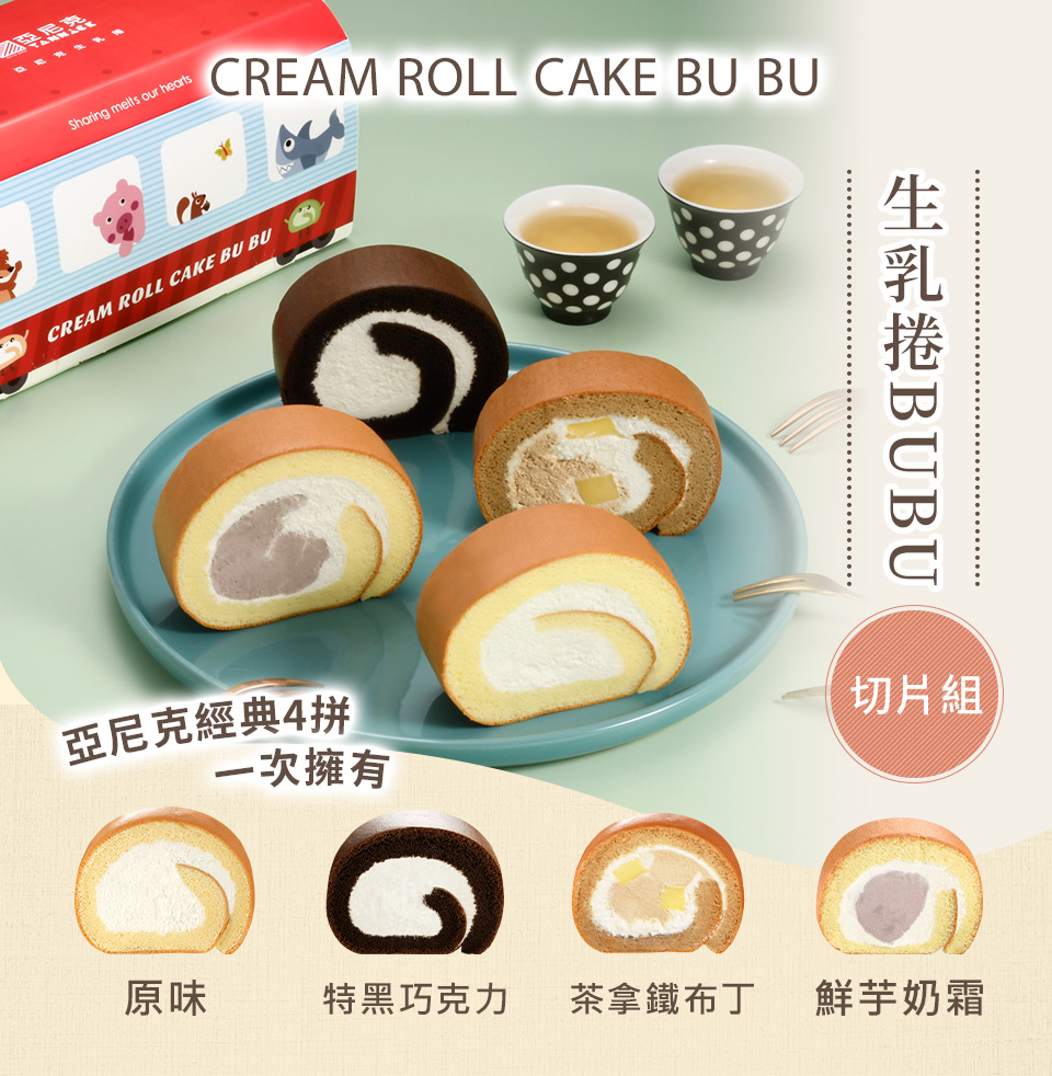 品名:生乳捲BUBU切片組-常態版主要內容物:原味生乳捲切片*1/特黑巧克力生乳捲切片*1/茶拿鐵布丁生乳捲切片*1/鮮芋奶霜生乳捲切片*1葷素:奶蛋素規格:4片/盒保存期限:冷藏2~3天內食用完畢◎依不同通路銷售及配送方式不同,實際效期依包裝所示