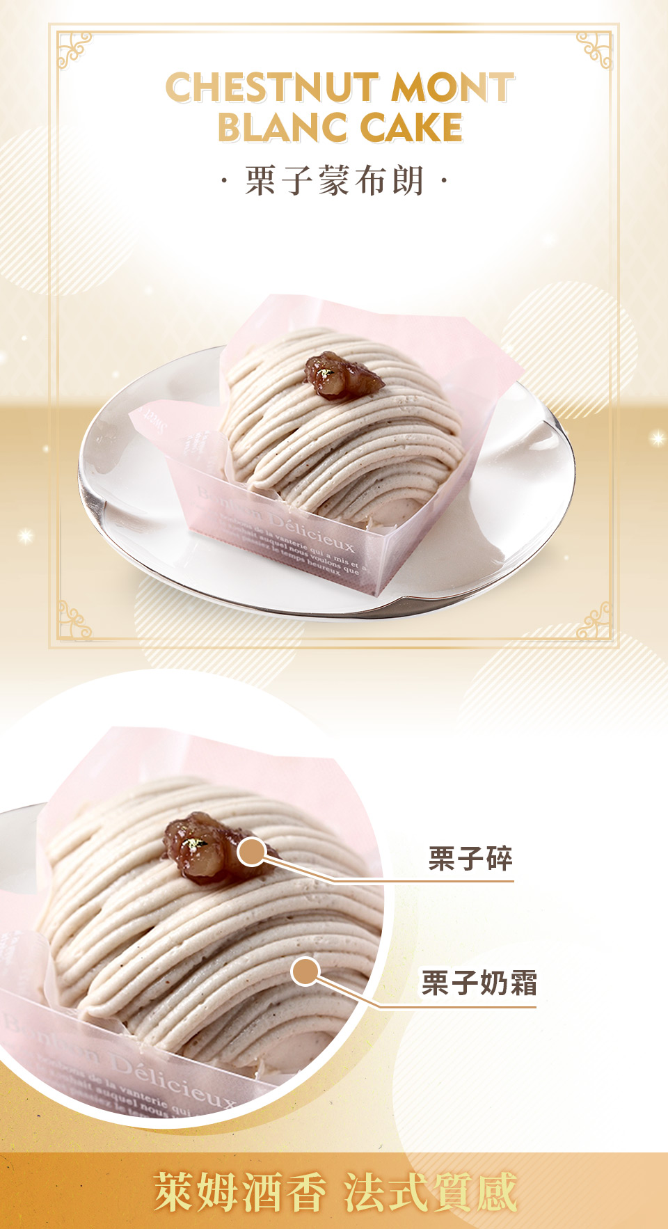 品名:法式栗子蒙布朗主要內容物:栗子慕斯/栗子餡/糖漬栗子碎粒/巧克力蛋糕/金箔葷素:葷規格:1片保存期限:冷藏2~3天,實際效期依包裝所示