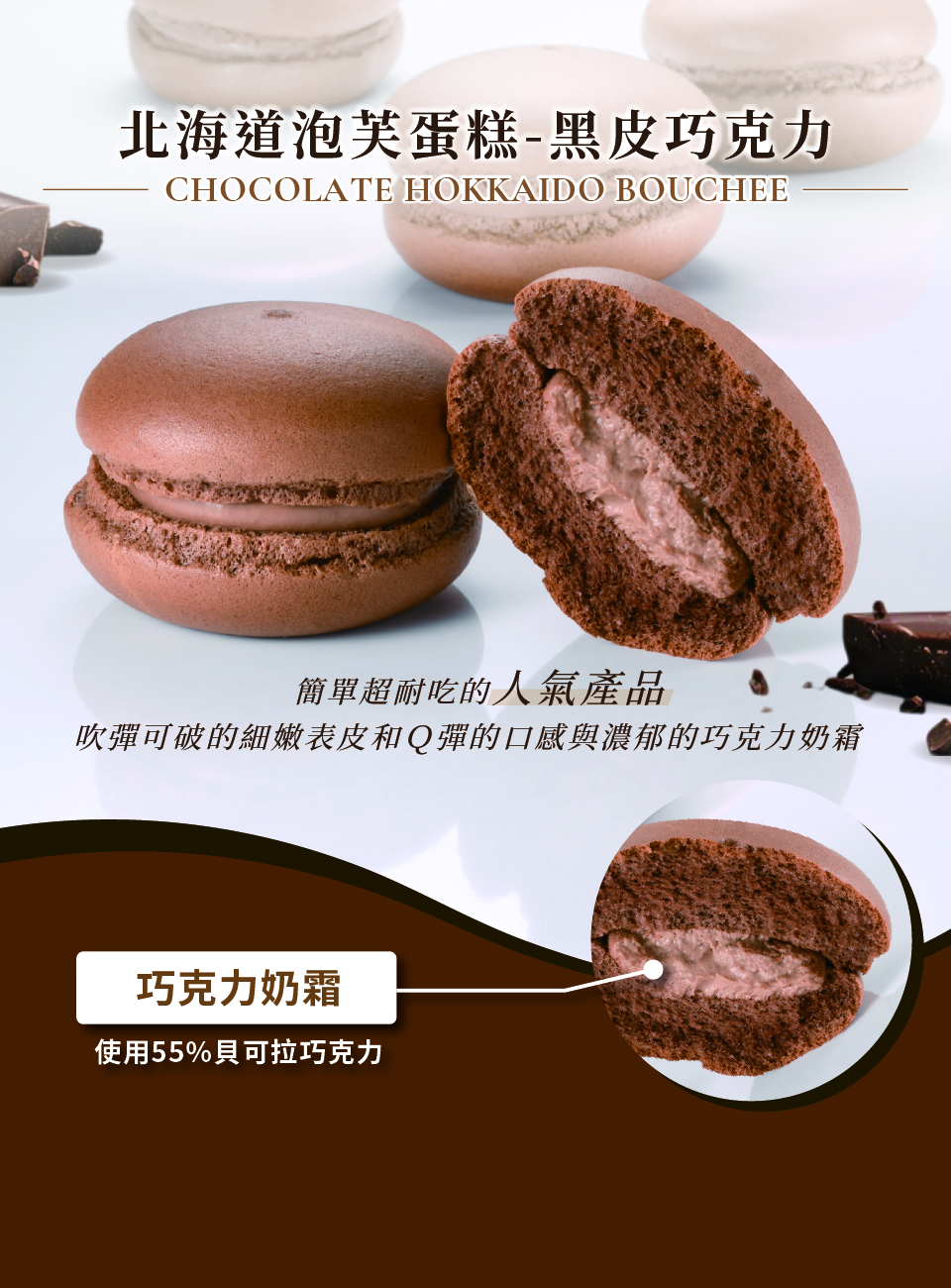品名:北海道泡芙-黑皮巧克力主要內容物:巧克力泡芙蛋糕/巧克力奶霜規格:1顆葷素:奶蛋素保存期限:冷藏2~3天,實際效期依包裝所示