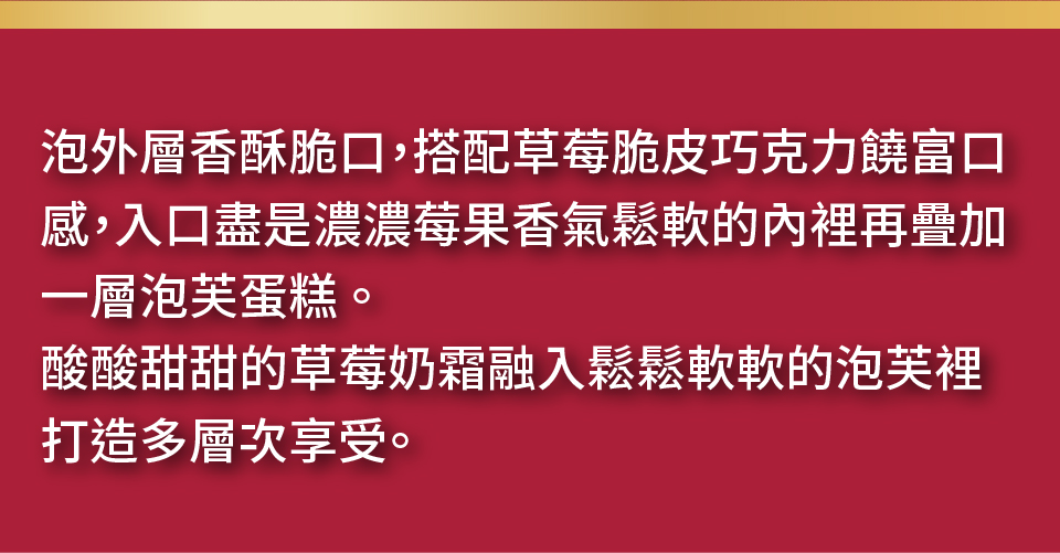 外層香酥脆口,搭配草莓脆皮巧克力饒富口感,入口盡是濃濃莓果香氣,鬆軟的內裡再疊加一層泡芙蛋糕。酸酸甜甜的草莓奶霜融入鬆鬆軟軟的泡芙裡打造多層次享受。