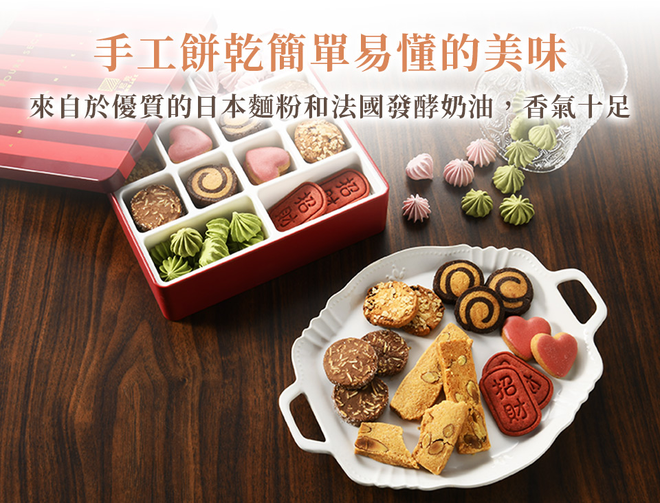 手工餅乾簡單易懂的美味來自於優質的日本麵粉和發酵奶油,香氣圓潤可口。將餅乾設計成輕巧小口的可愛模樣,並變化出質地輕盈或輕脆、香酥與或硬脆等不同口感,讓餅乾迷們可同時享受不同風味的餅乾。