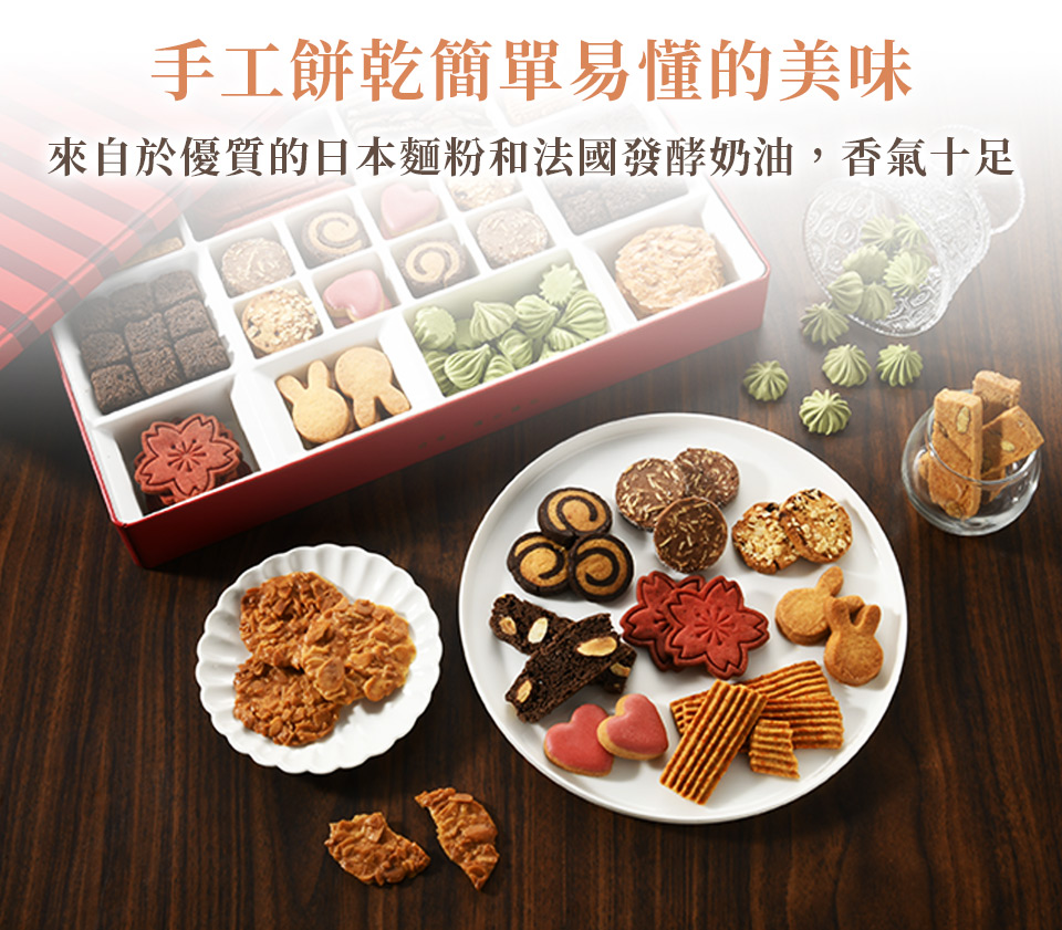 手工餅乾簡單易懂的美味來自於優質的日本麵粉和發酵奶油,香氣圓潤可口。將餅乾設計成輕巧小口的可愛模樣,並變化出質地輕盈或輕脆、香酥與或硬脆等不同口感,讓餅乾迷們可同時享受不同風味的餅乾。