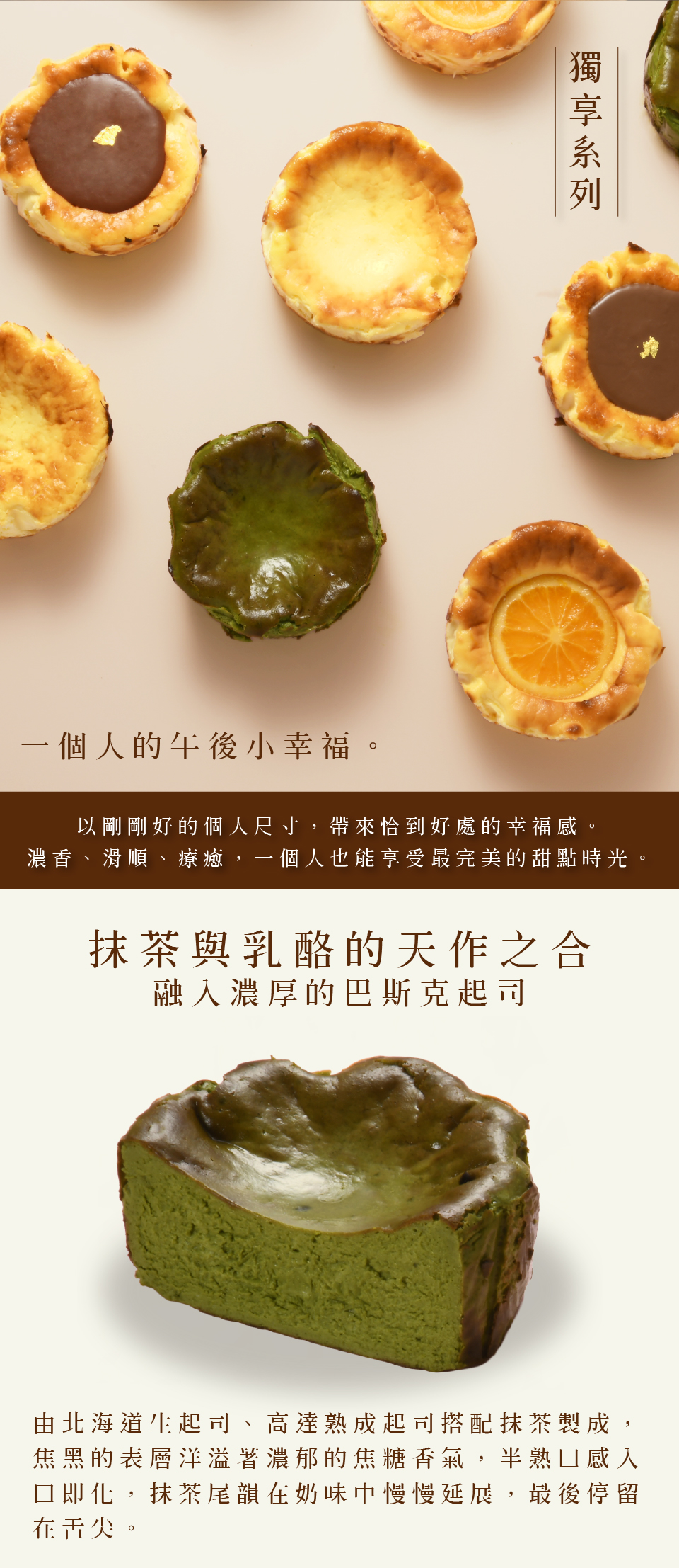 由北海道生起司、高達熟成起司搭配抹茶製成,焦黑的表層洋溢著濃郁的焦糖香氣,半熟口感入口即化,抹茶尾韻茶香高雅、餘韻回甘。剛剛好的份量,一不小心,整顆就吃完了!