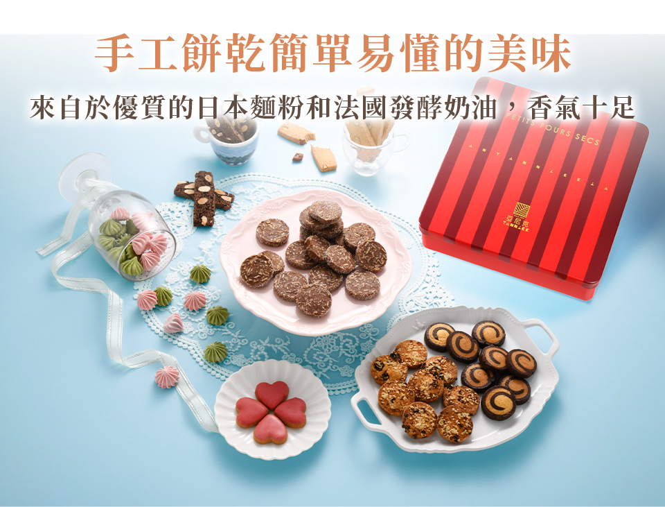 手工餅乾簡單易懂的美味來自於優質的日本麵粉和發酵奶油,香氣圓潤可口。將餅乾設計成輕巧小口的可愛模樣,並變化出質地輕盈或輕脆、香酥與或硬脆等不同口感,讓餅乾迷們可同時享受不同風味的餅乾。