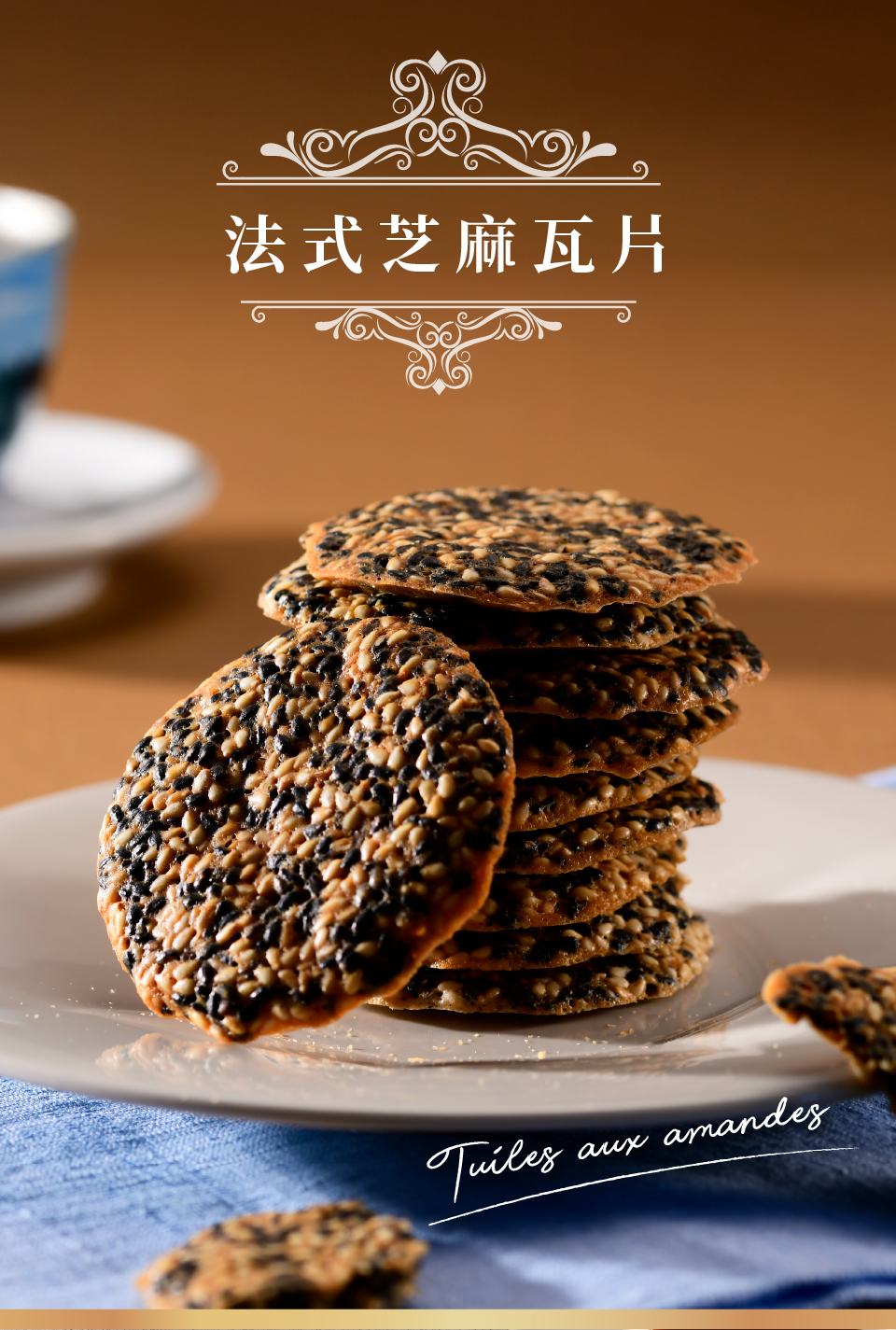 品名:法式瓦片系列-芝麻瓦片主要內容物:黑芝麻/白芝麻/砂糖/雞蛋/日本麵粉/無鹽發酵奶油規格:1盒(12片)葷素:奶蛋素保存期限:常溫30天◎依不同通路銷售及配送方式不同,實際效期依包裝所示