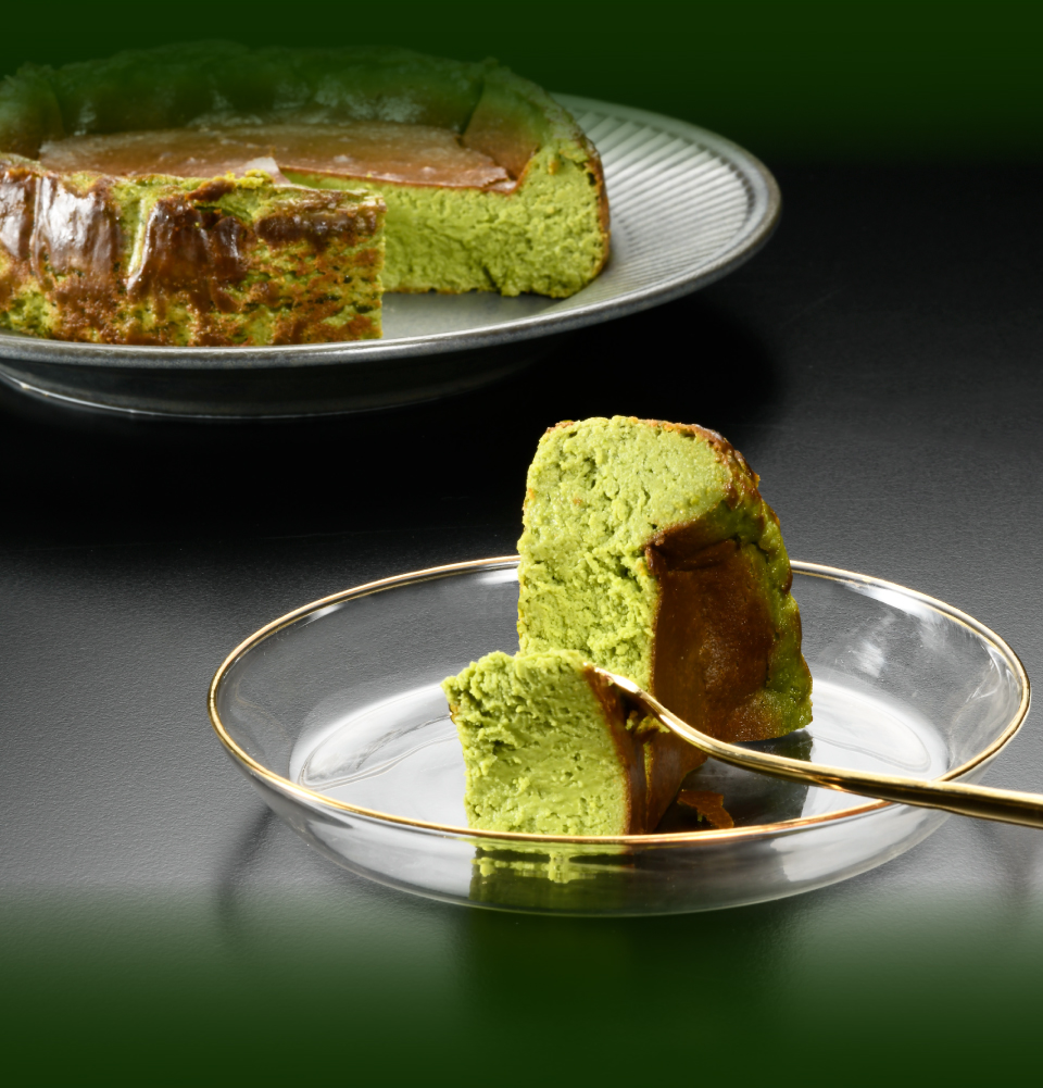 由北海道生起司、高達熟成起司搭配抹茶製成,焦黑的表層洋溢著濃郁的焦糖香氣,半熟口感入口即化,抹茶尾韻茶香高雅、餘韻回甘。