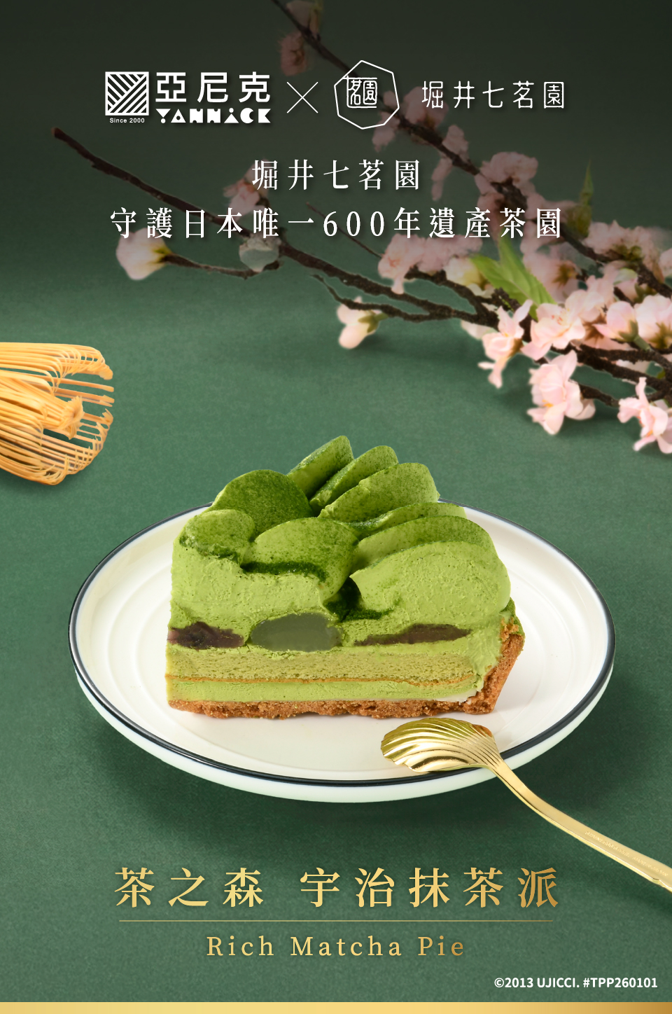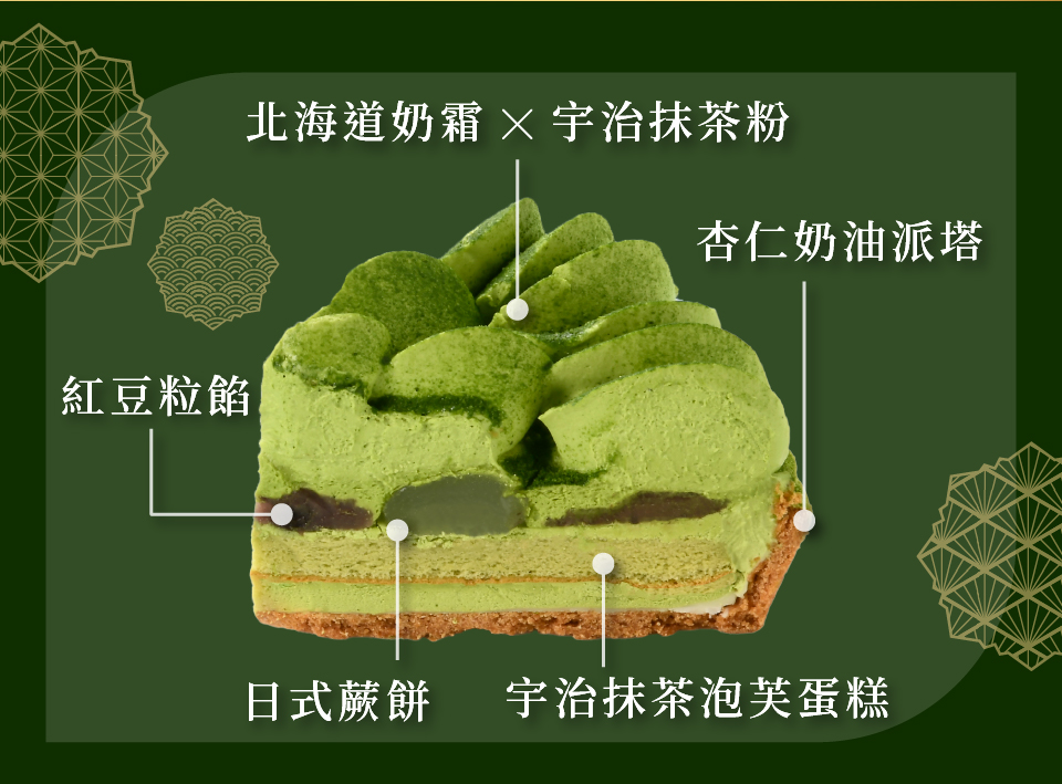 守護600年日本遺產茶園 茶道級抹茶使用奢侈地使用京都宇治百年茶舖「堀井七茗園」,使用宇治一番茶、100%石臼研磨,彌足珍貴的抹茶粉蘊含600年茶園歷史的職人堅持。茶韻層次豐富的宇治抹茶粉與北海道奶霜結合,形成一股清爽又甘甜的茶奶香。搭配點綴其中的紅豆餡與蕨餅,最後用酥脆派塔完美收尾。※宇治抹茶活性高,經過光線照射容易造成商品氧化褪色,為正常現象,請安心享用。※切片商品可能因配送造成些許歪斜與沾黏為正常現象,如無法接受建議使用門市取貨服務。※若切片蛋糕購買乙片以上,將合併包裝,如需單獨包裝,再請於寄送備註填寫。最快到貨日:訂購後4天(貨運宅配 週日、週一無配合配送)