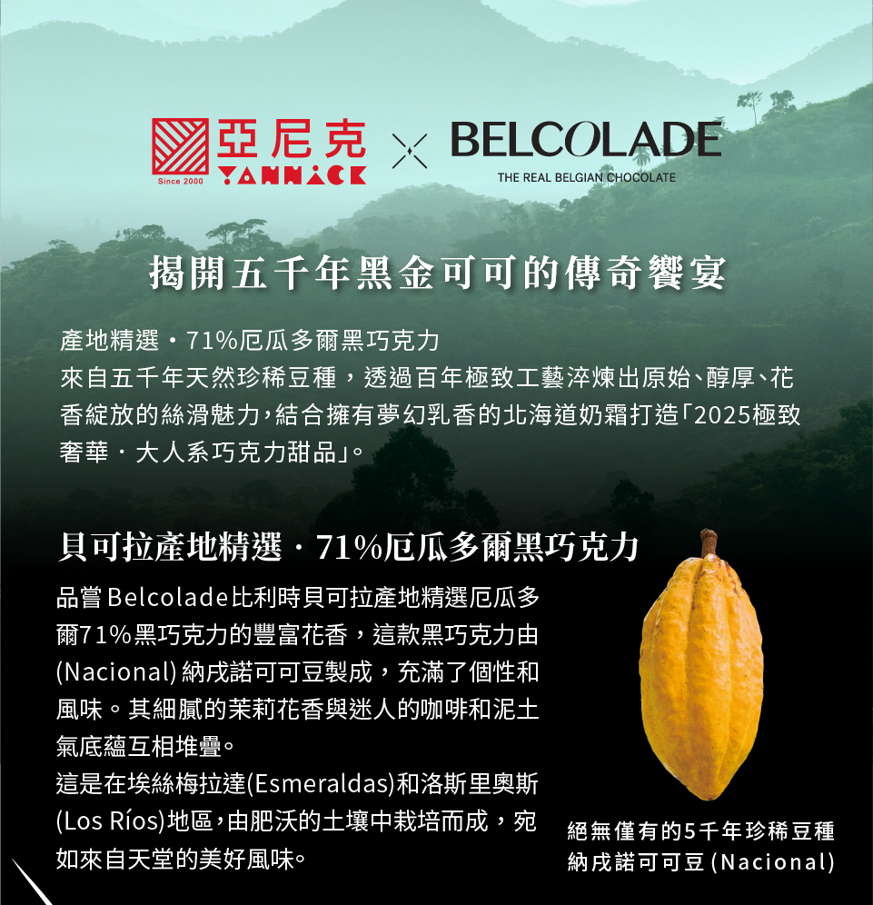 嚴選比利時貝可拉產地精選——71%厄瓜多爾黑巧克力,承載五千年天然珍稀可可豆種的傳奇,綻放優雅茉莉花香與獨特個性。