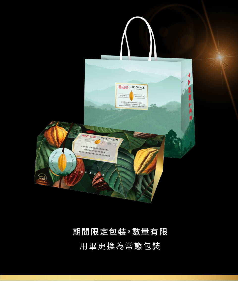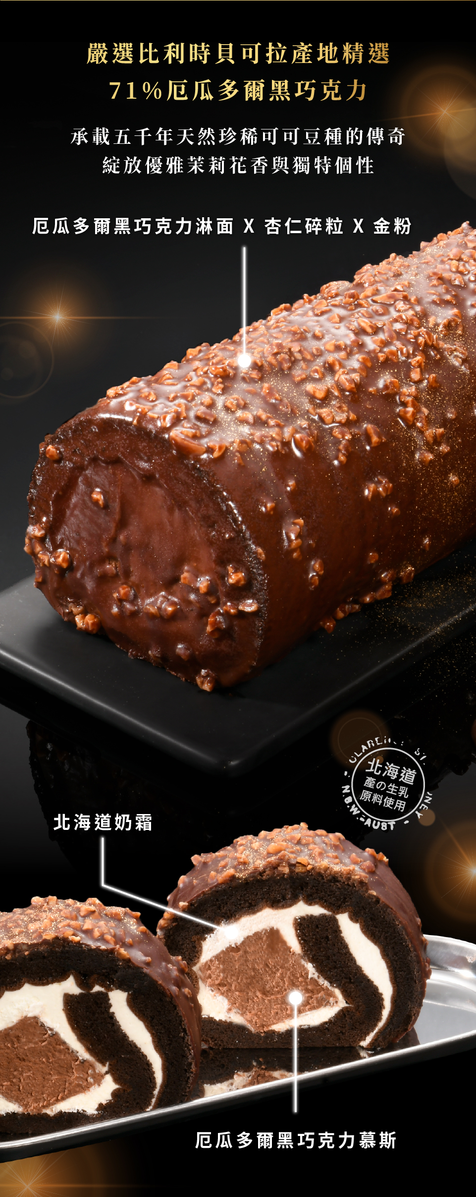 團購任選4件88折 $615/條▶每月6號 生乳捲日只要 $578/條團購任選7件76折 $531/條▶每月6號 生乳捲日只要 $499/條金粉縈繞 醇厚、酥脆「極致奢華大人味」嚴選比利時貝可拉產地精選——71%厄瓜多爾黑巧克力,來自於絕無僅有的五千年天然珍稀可可豆種,綻放優雅花香與獨特個性。特黑泡芙蛋糕外層以金粉點綴在杏仁黑巧克力脆皮上閃耀登場,口感酥脆、風味濃郁醇厚,絲滑帶堅果花香尾韻;內餡北海道乳香環繞著巧克慕斯,於舌尖交織層層堆疊的口感,帶來「極致奢華的大人味」,一口揭開黑金可可的傳奇饗宴。每日數量有限,售完為止產品附贈表格 產品 附贈狀況 產品 附贈狀況 盤叉 ✗ 小牙刀 ✓ 提袋 ✓ 蠟燭 ✗