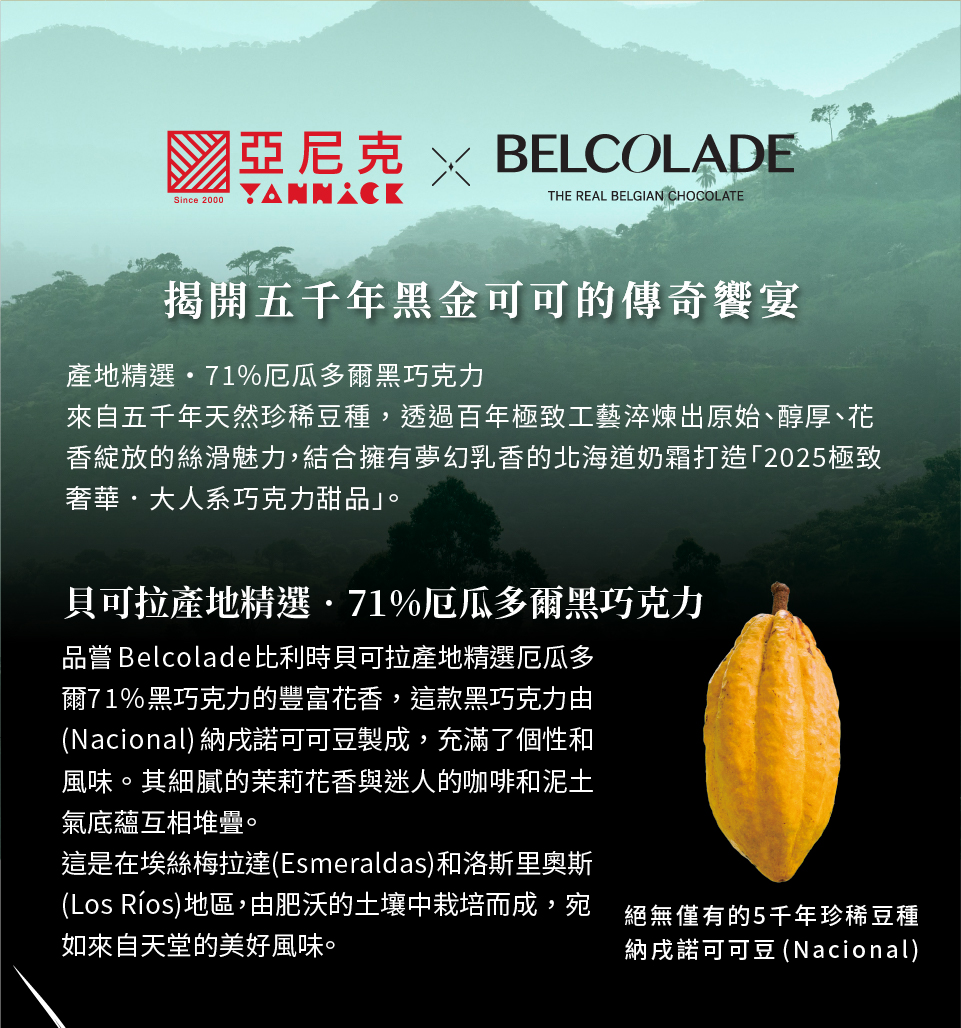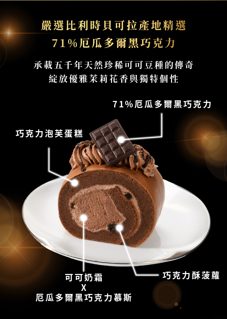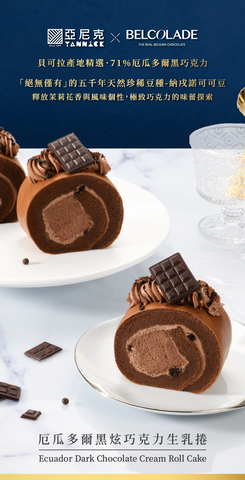 以特調可可奶霜與厄瓜多爾黑巧克力慕斯呈現特濃郁的巧克力生乳捲,特別以厄瓜多爾黑巧克力片裝飾蛋糕,可以完整品嚐到產地精選的風土個性。