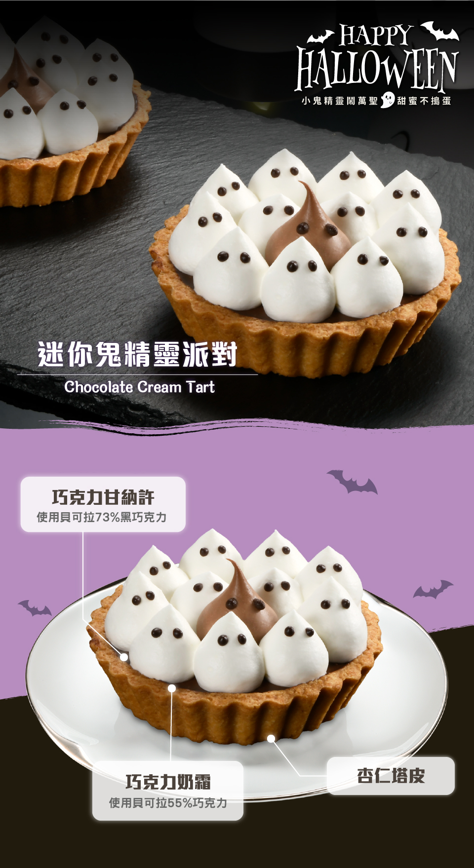 品名:迷你鬼精靈派對主要內容物:巧克力酥波蘿/貝可拉73%巧克力甘納許/法國鮮奶油/北海道奶霜/巧克力奶霜/杏仁塔皮