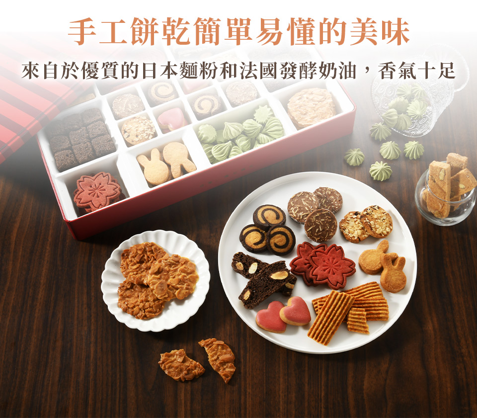 手工餅乾簡單易懂的美味來自於優質的日本麵粉和發酵奶油,香氣圓潤可口。將餅乾設計成輕巧小口的可愛模樣,並變化出質地輕盈或輕脆、香酥與或硬脆等不同口感,讓餅乾迷們可同時享受不同風味的餅乾。