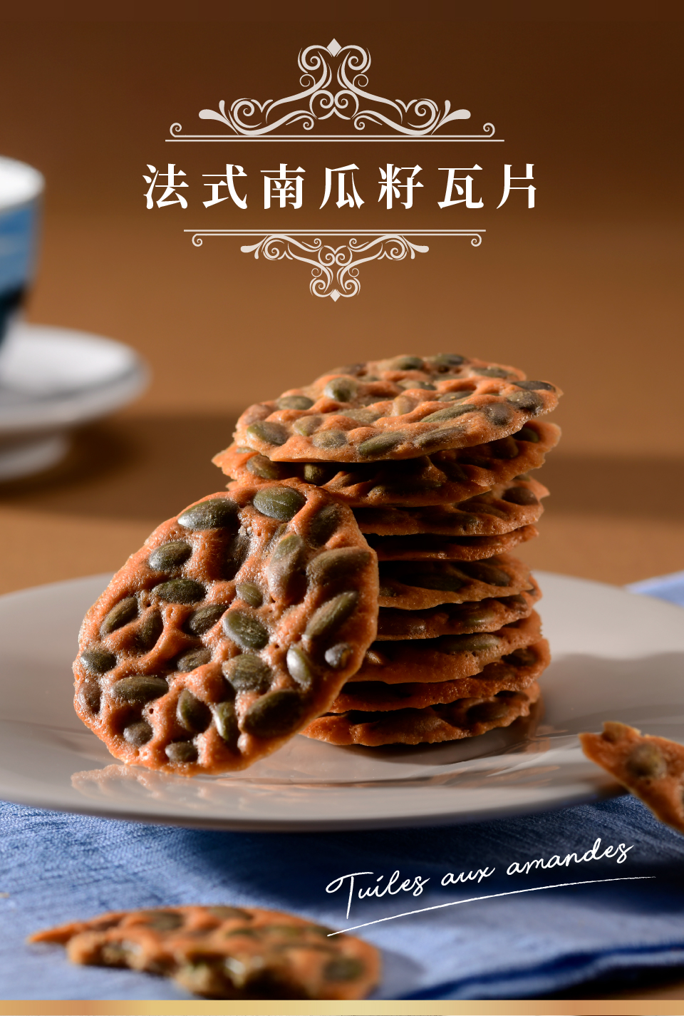 品名:法式瓦片系列-南瓜子瓦片主要內容物:南瓜子/砂糖/雞蛋/日本麵粉/無鹽發酵奶油規格:1盒(12片)葷素:奶蛋素保存期限:常溫30天◎依不同通路銷售及配送方式不同,實際效期依包裝所示