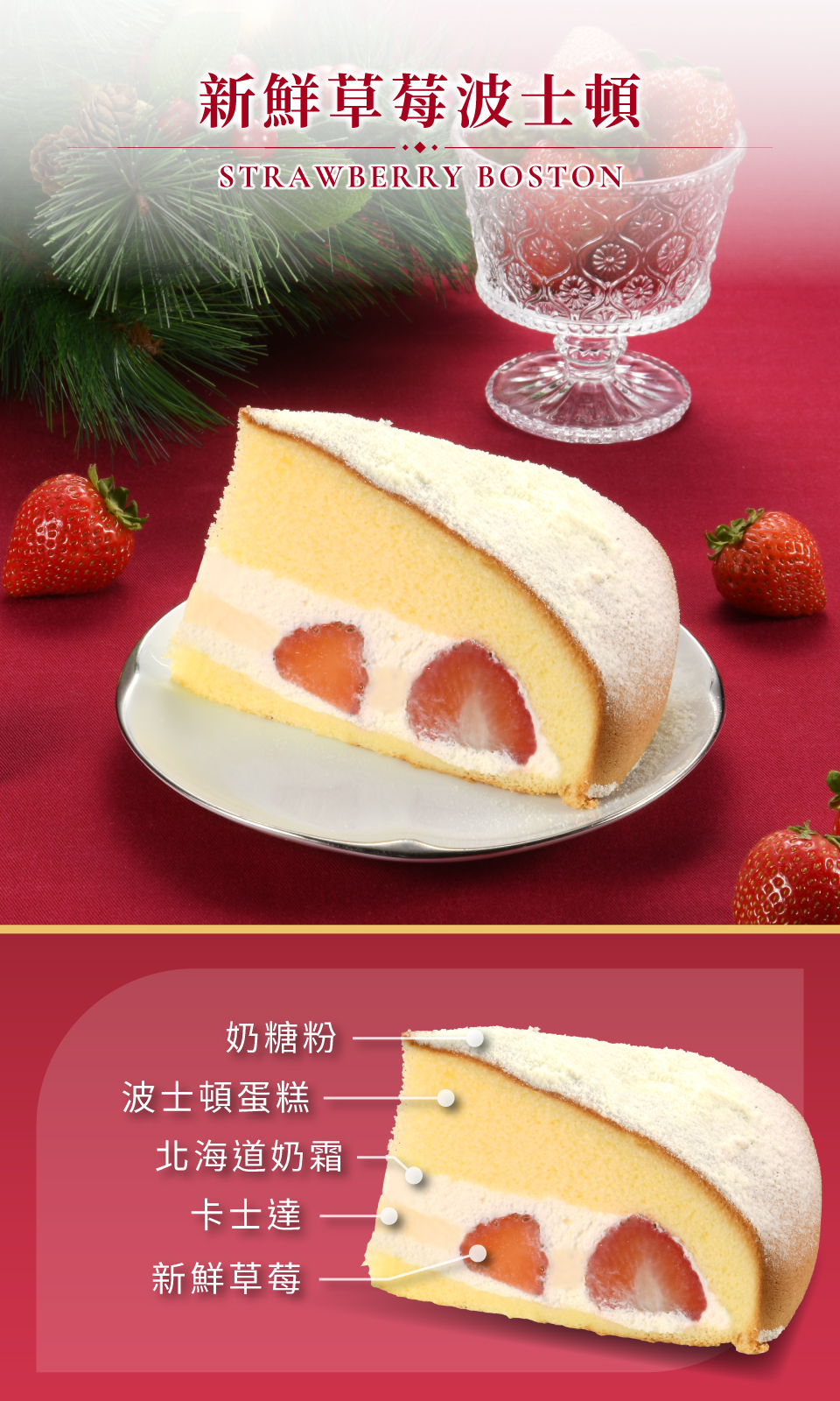 品名:新鮮草莓波士頓-切片主要內容物:波士頓蛋糕/法國鮮奶油/北海道奶霜/卡士達/新鮮草莓葷素:奶蛋素規格:1片保存期限:冷藏1~2天內食用完畢,實際保存期限請見包裝標示
