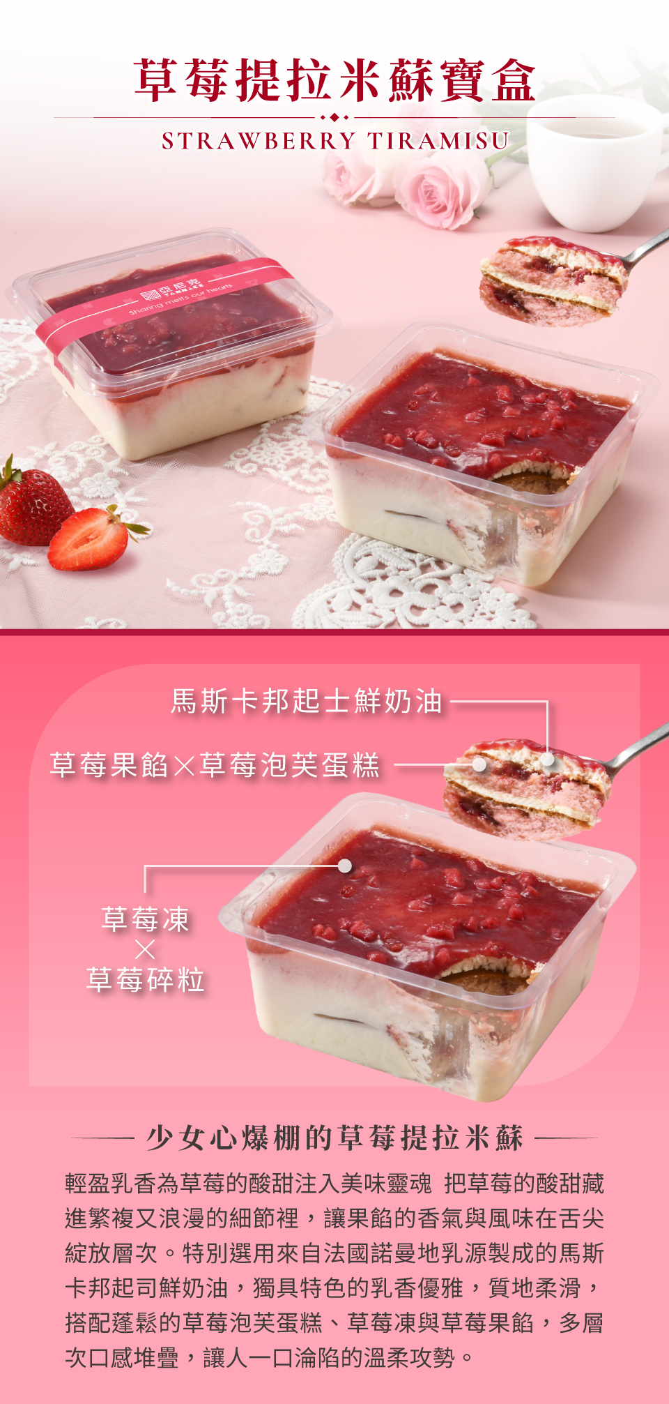 品名:草莓提拉米蘇寶盒主要內容物:馬斯卡彭起士鮮奶油/草莓泡芙蛋糕/草莓果餡/草莓凍/草莓碎粒葷素:葷規格:1盒保存方式:冷藏保存期限:冷藏2~3天內食用完畢,實際保存期限請見包裝標示