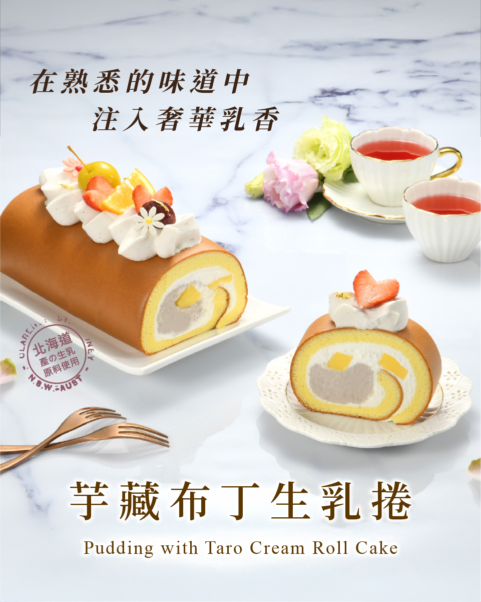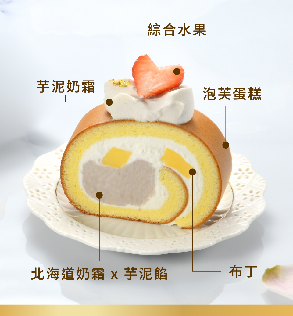 當日訂購商品!逾期無法領取商品皆為新鮮製作,請確認門市現有庫存再訂購在熟悉的味道中注入奢華乳香以繽紛多彩的水果與巧克力片搭配清爽的芋泥奶霜點綴在柔軟的泡芙蛋糕,為這款純樸的生乳捲增添視覺的華麗動感。運用北海道奶霜豐沛的乳香佐檳榔心芋泥一起捲入Q彈的泡芙蛋糕中,透過奶霜與芋泥不同的比例搭配建構層次,再佐以滑嫩布丁增添口感,入口盡是濃郁香醇的芋泥乳香,豐厚甜美不失清爽。 產品附贈表格 產品 附贈狀況 產品 附贈狀況 盤叉 ✗ 小牙刀 ✓ 提袋 ✓ 蠟燭 ✗
